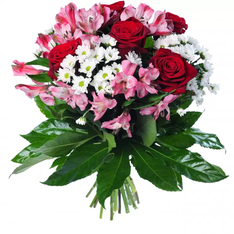 - Kytice z růží, santin a alstromérii potěší každou dívku a ženu.