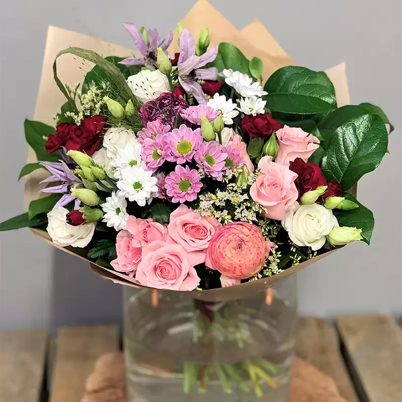 Jemné trsové růže, drobné květy santinek , mini karafiátů a eustomy vytváří pěkný celek.