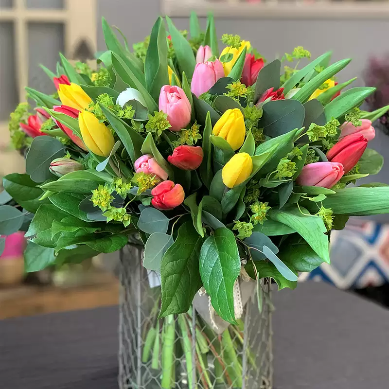 - veselý mix tulipánů doplněný zelenou přízdobou