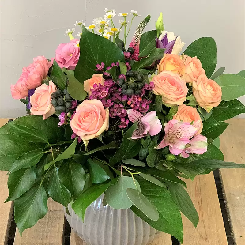 Květina je uvázána vzdušně v jemných růžových barvách. Trsovým růžím, heřmánku a alstromériím to spolu ladí.