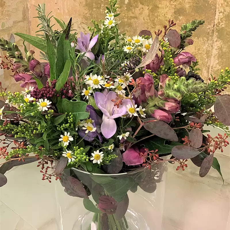 Květina je uvázána z hledíků, heřmánku, solidága a frézií. Aranžmá je uspořádáno do rozevláté kytice.