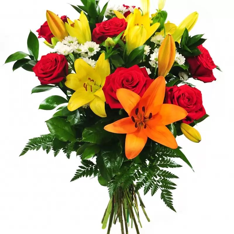 Barevná kytice uvázaná dokulata z lilií, červených růží, santinek a zeleně.