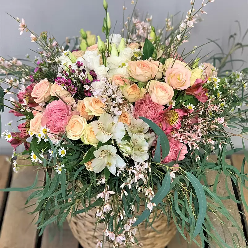 Kytice je vhodná pro romanticky založené slečny a ženy. Heřmánek, trsové růže, eustoma a hlavně voňavá genista s waxem dodají iluzy louky.