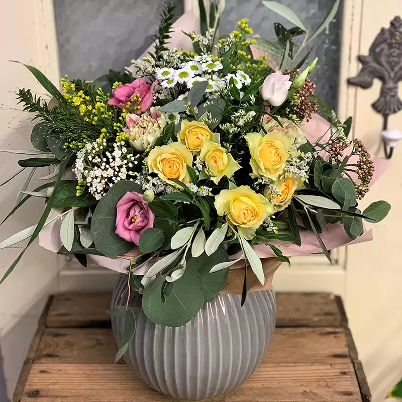 Optimistická kytice vázaná do kulata v růžovo žluté barvě. Základ luční aranže tvoří eustoma, santina, trsové růže a solidágo.